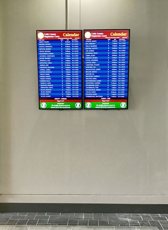 Cobb County, Georgia, prides itself on having some of the most innovative courts in the nation. Even though the Cobb County Government is a pioneer of divorce programs and seminars, the individual county courts still lacked modernization with patrons relying on paper dockets to find their respective courtrooms. Located in one of the most populated counties in Georgia, the Cobb County Courts were flooded daily with visitors who needed direction and assistance, contributing to patron congestion and distracting staff. The Cobb County Government searched for a solution to alleviate the stress on both visitors and personnel. After much research, Cobb County selected Infax to provide its digital signage software solutions.